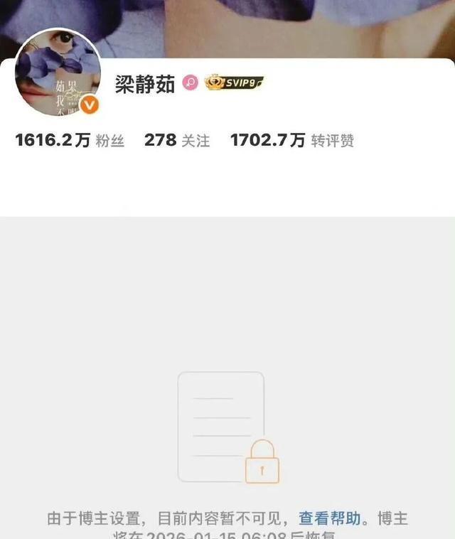 1月8日,有网友发现,梁静茹的社交平台已设置不可见,页面显示将在2026年1月15日6:08后恢复。