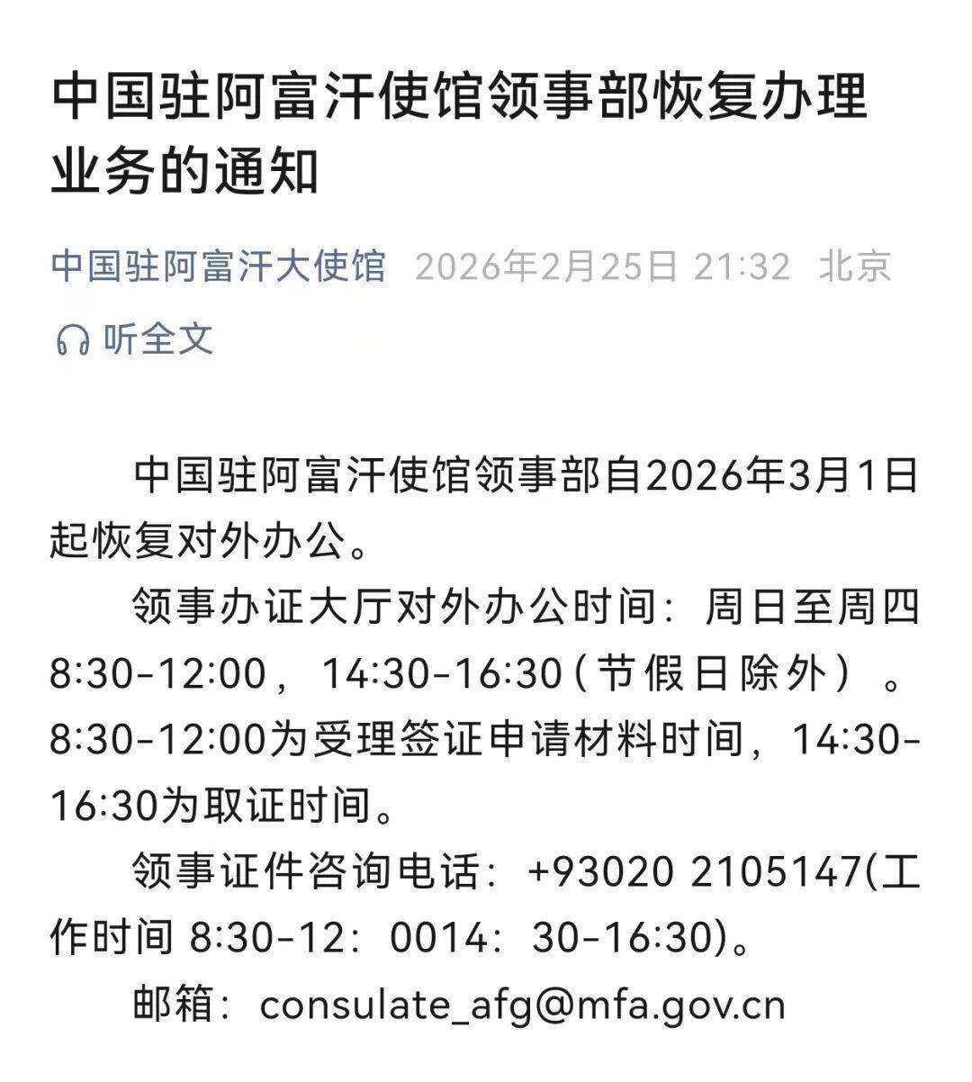 2月 25日, 中国驻阿富汗大使馆发布通知:中国驻阿富汗使馆领事部自2026年3月1日起恢复对外办公。